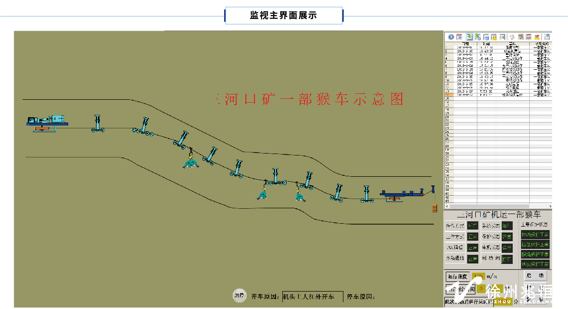 (7)每100米設(shè)置拉線急停保護(hù),需要手動復(fù)位后才能啟車。監(jiān)控計算機能實時顯示各個保護(hù)的動作狀態(tài)與保護(hù)的位置。