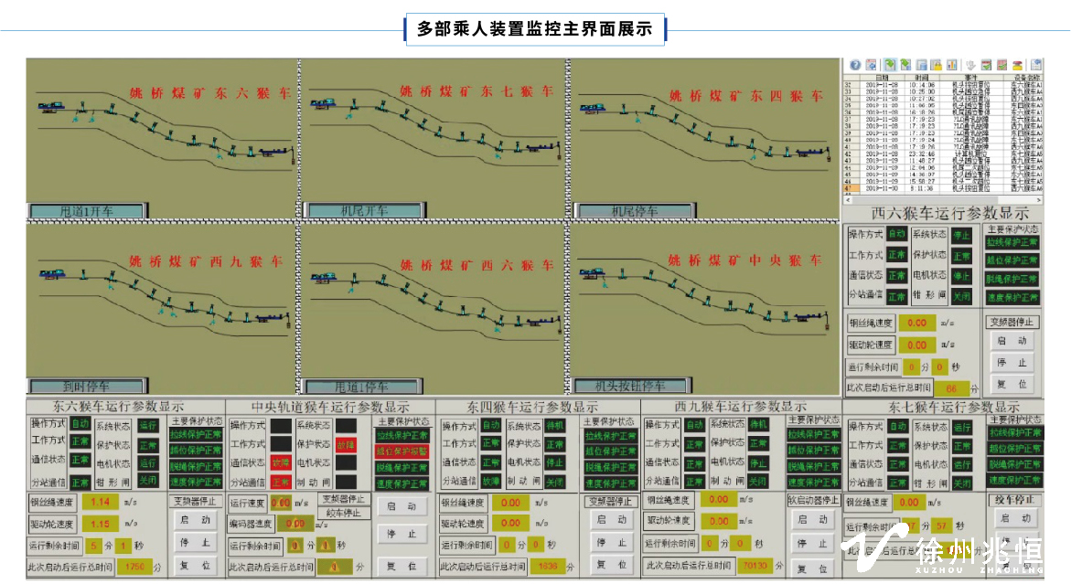 能夠通過地面計算機或井下就地箱上的顯示屏顯示架空乘人裝置的運行狀態(tài)(動態(tài)畫面);能夠顯示電動機或整個運行系統(tǒng)的主要參數(shù)(包括電機電流、運行速度、運行時間等參數(shù));顯示保護(hù)傳感器動作的位置和故障信息等。
