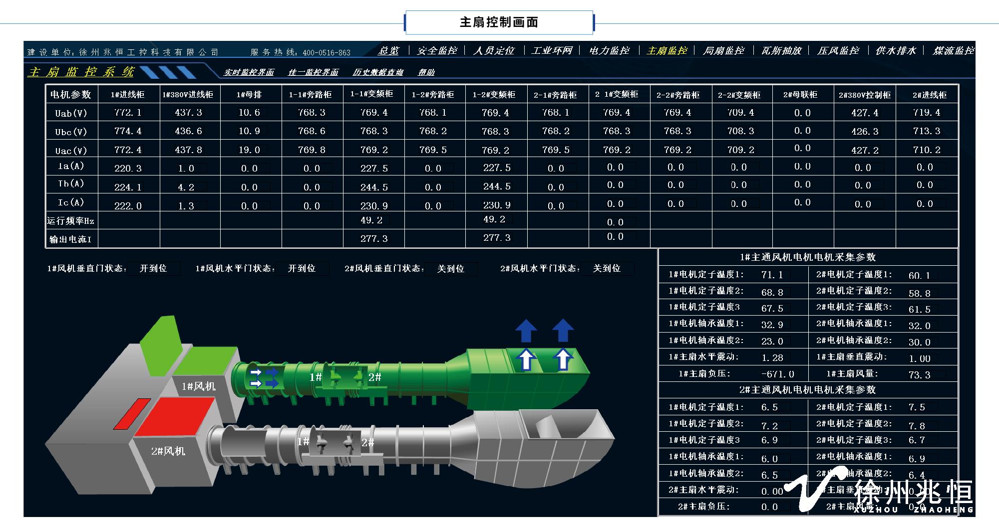 礦井主通風機是煤礦生產中不可缺少的的重要設備,其安全、可靠、高效運行倍受重視。我公司研發的主通風機自動監控與能效優化系統,實現了對通風機的遠程監控;能夠就地一鍵倒機;能夠全面監測、傳送、存儲、分析風機的各種運行參數;根據通風系統的工況,調整風機轉速和風門,實現能效優化。