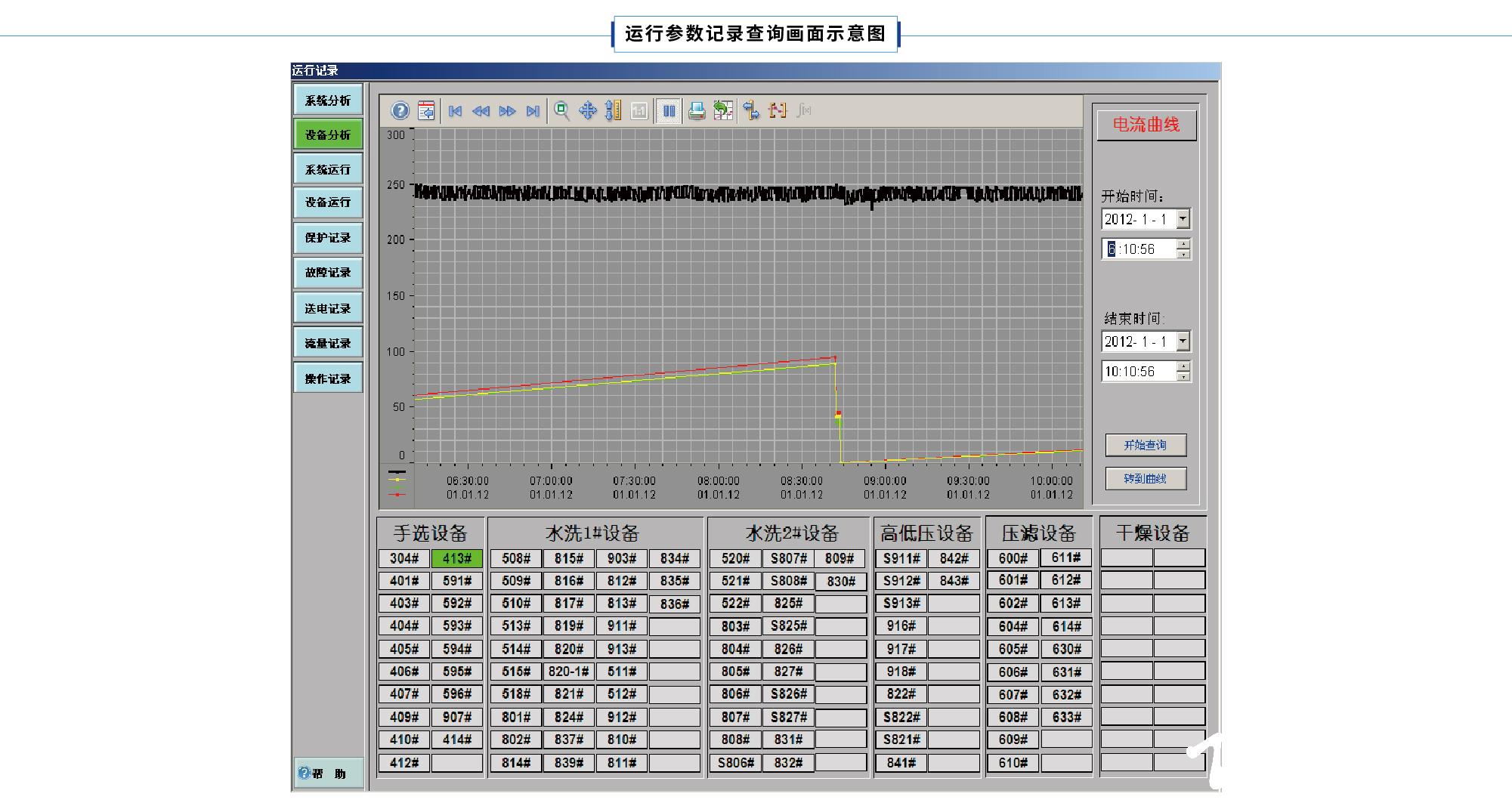 14)設(shè)備運行記錄:實時記錄設(shè)備的開停狀況,能查詢1年內(nèi)的設(shè)備的開停情況,并自動累計運行時間,開停次數(shù)等。記錄內(nèi)容包括:設(shè)備名稱、開車時間、開車方式、停車時間、停車原因、運行時間等。