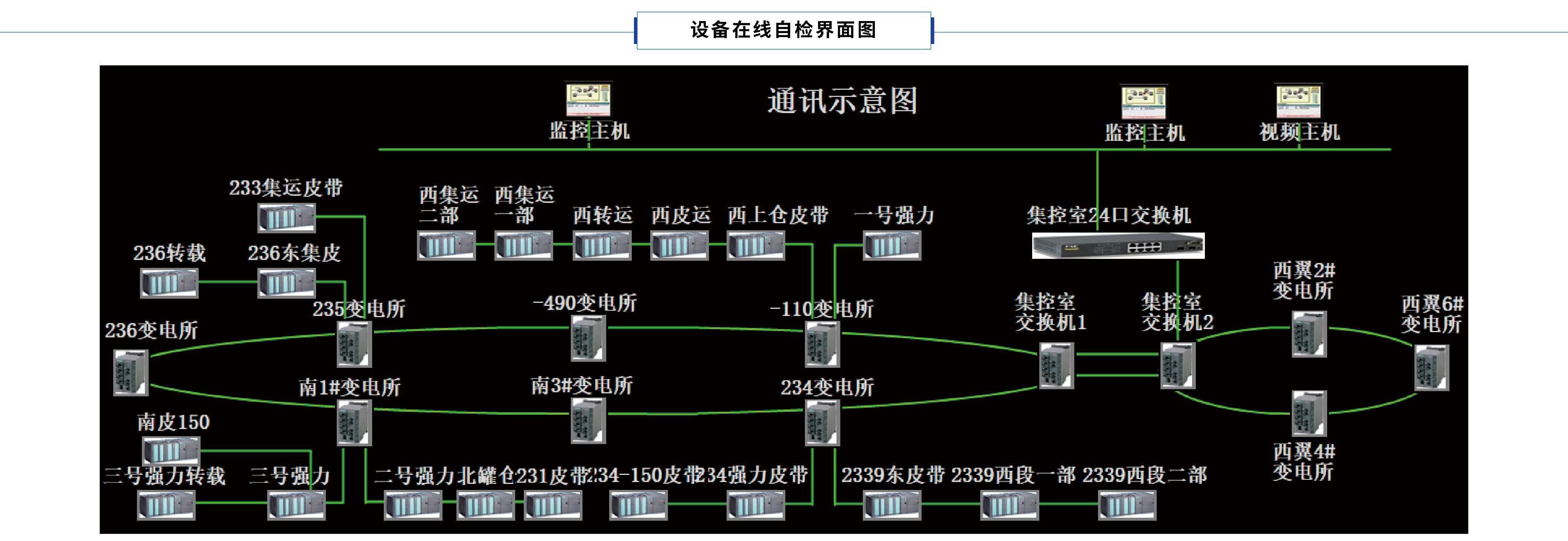 當前,主運輸集控系統涉及設備較多,包括主控PLC、環網交換機、節點交換機、設備控制分站、數據采集分站、視頻攝像頭、地面服務器、計算機、沿線語音終端等,任何一個設備斷電或者由于其他故障導致設備離線,都將影響整個主運輸系統或局部功能的正常運行,甚至造成系統宕機,影響主運輸系統的正常開停,造成重大損失。因此,本系統實現對控制系統主要設備的全面實時自檢 。