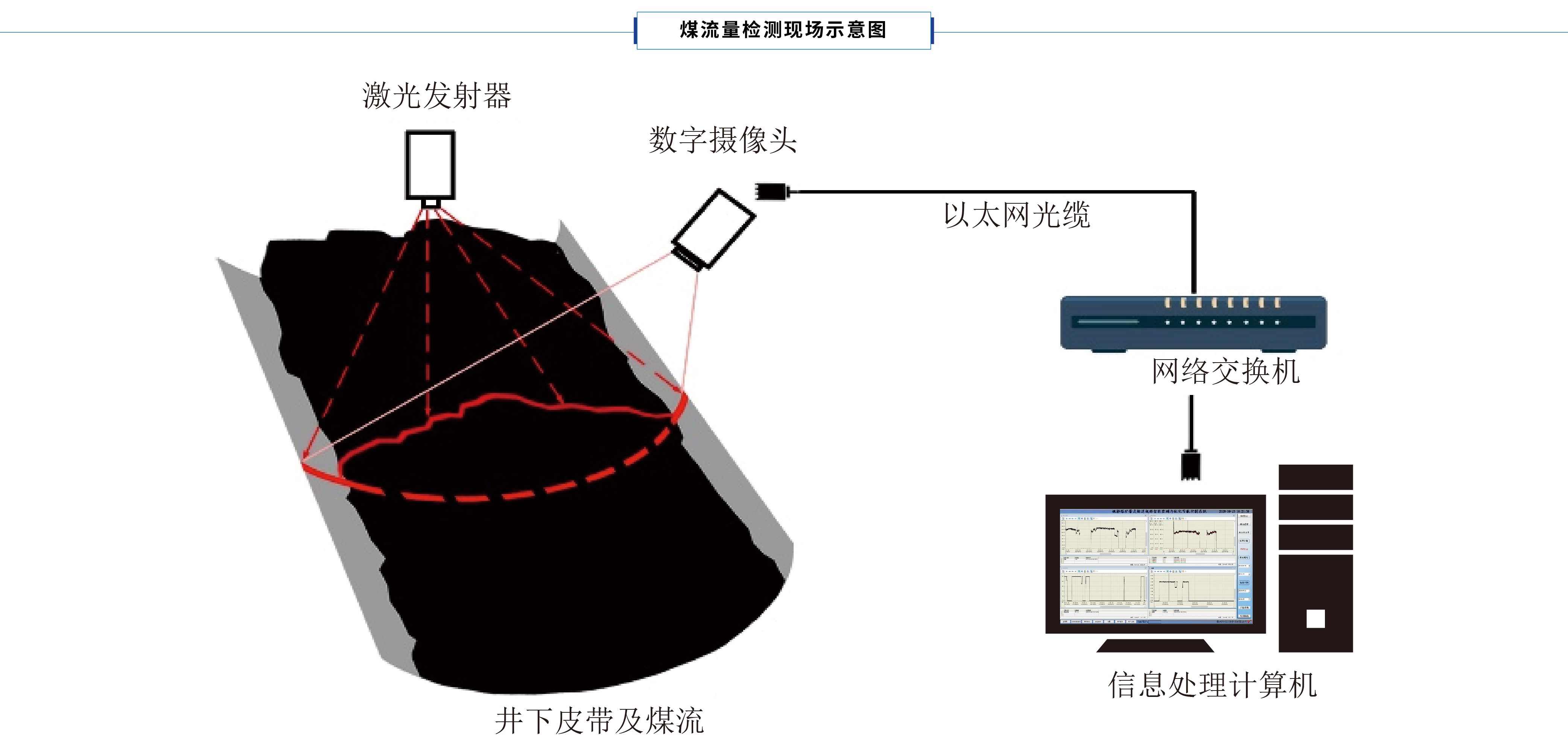 基于AI技術的煤流量識別系統主要由智能AI攝像儀、激光輔助發射器、后臺數據處理計算機等組成。其中激光發射器將激光線條投射在煤流表面,AI攝像儀作為現場監控設備實時采集現場激光煤流畫面,通過礦井工業網絡將數據上傳到地面計算機進行煤流量的實時計算,并計算結果及時反饋給調速裝置。