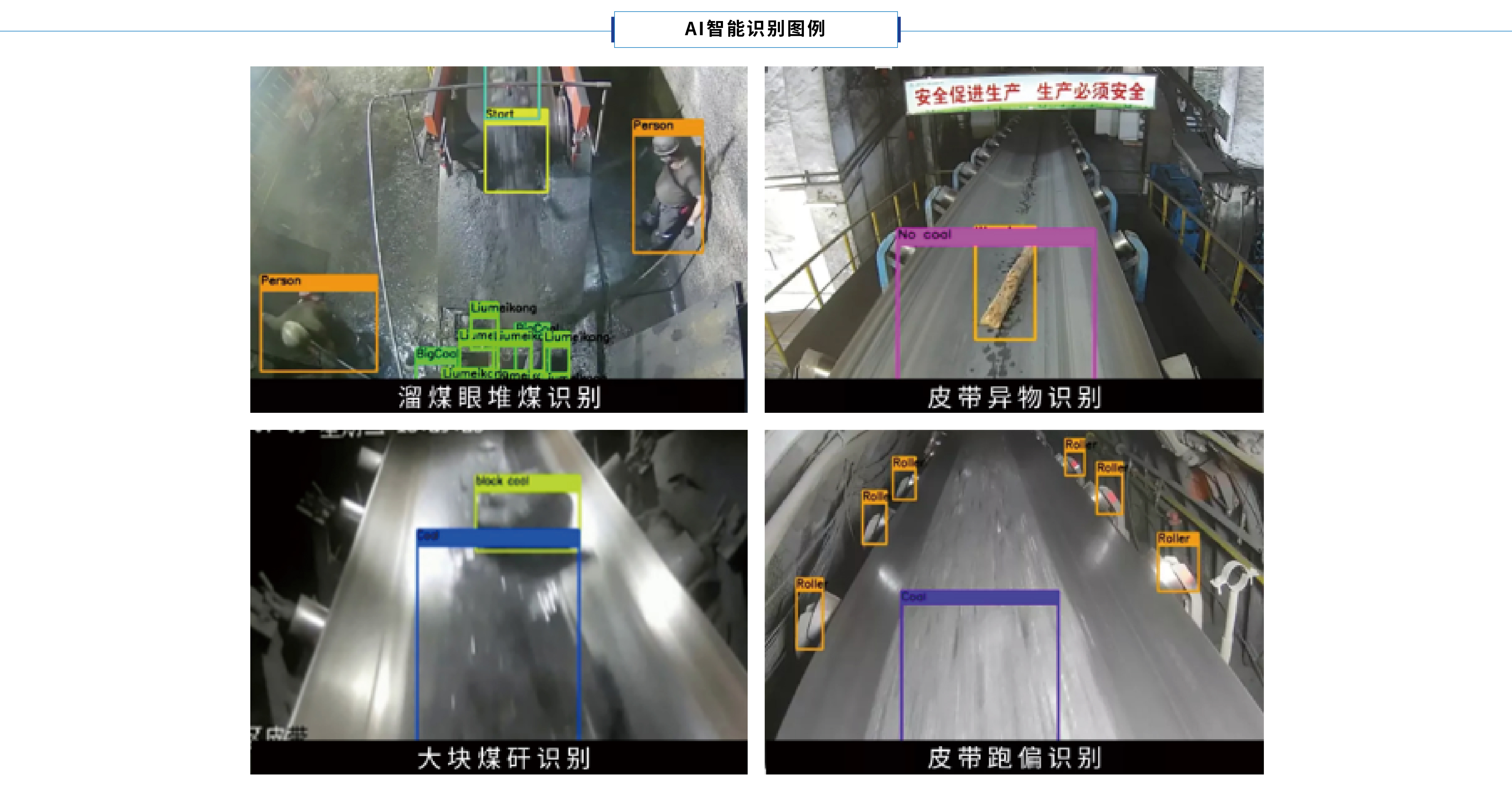 《煤礦智能化建設指南》中關于“智能主煤流運輸系統”的建設意見指出:鼓勵應用基于AI煤量智能識別、人員違規作業智能監測、大塊煤/堆煤/異物識別與預警功能。本系統AI智能識別技術與煤流輸送場景進行深度融合,實現皮帶運輸過程中轉載點堆煤、皮帶異物、皮帶跑偏、皮帶撕裂的智能監控、危險區域人員作業的智能監控,為實現智能感知、智能決策、自動執行的全礦井煤流智能運輸系統。